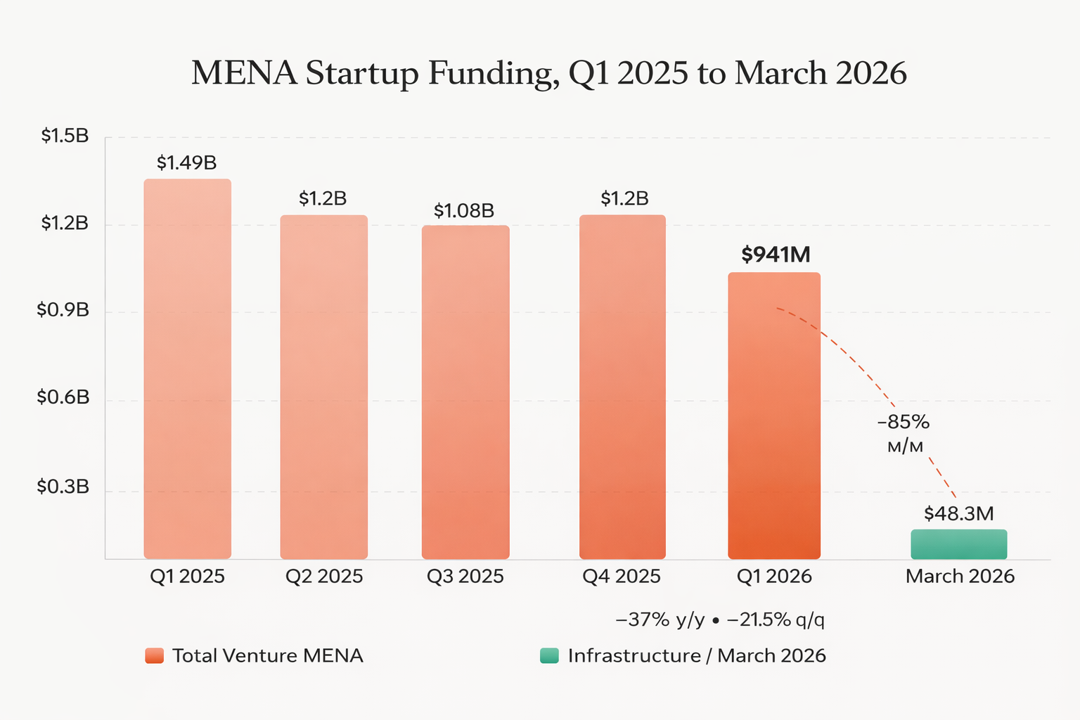 The first quarter of 2026 closed with total MENA startup funding at $941 million — down 21.5% quarter-on-quarter and 37% year-on-year. Context matters: the peak quarter in 2022 reached $2.1 billion. The downward trajectory has been in place for several quarters and has merely accelerated amid geopolitical escalation in the Strait of Hormuz.